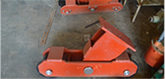 →焊接完畢的待穿管PE管道,應(yīng)每隔5m設(shè)1組托輥支架對其進(jìn)行支撐。穿管作業(yè)時(shí),前行的PE管道帶動(dòng)滾筒圍繞軸桿轉(zhuǎn)動(dòng),接觸面呈滾動(dòng)摩擦狀態(tài)